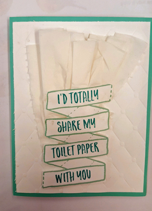 On Carol’s Share Sunshine #2 she used actual toilet paper! I think it is so cute, and although TP is more available these days, her card is still right on.
