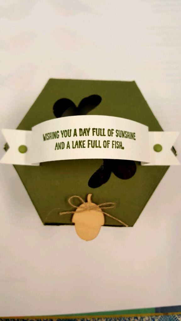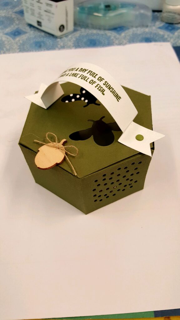 Gerri shared a box made with the Window Box Thinlits. This product retired in 2019, but if you have this in your arsenal you can make some wonderful boxes for any season. Gerri chose to make her box in fall colors. This box is still one of my favorites – I love the cutouts on each side. You can embellish the box to your heart’s content to make it extra fancy, or keep it simple. You can fill these boxes with just about anything, including a battery-operated tea light. Wouldn’t an array of these candle-lit boxes look beautiful on your fall party table? And if you wish, your guests can each take one home to enjoy.